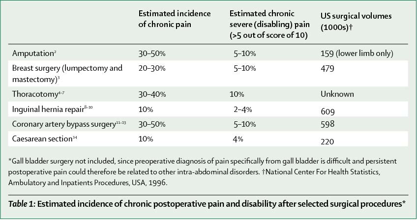 Scars are now recognized as a key source of physical stress. Scars directly connect to the skin through the peripheral and central nervous systems, so any injury to the skin or underlying fascia will cause a prolonged sympathetic response. It is theorized that each surgery or injury compounds this stress aggravation until the sympathetic nervous system goes into hyper load, resulting in disease or prolonged chronic post-surgical pain. It is reported up to one third of patients undergoing common surgical procedures report persistent or intermittent pain, called chronic post surgical pain (CPSP), of varying severity at one year postoperatively. (Lancet 2006)