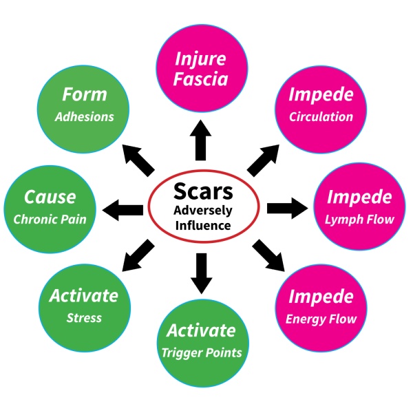 Scars create internal adhesions inside the body. Adhesions act as internal “strait jackets”, reducing muscle and organ performance and producing pain.